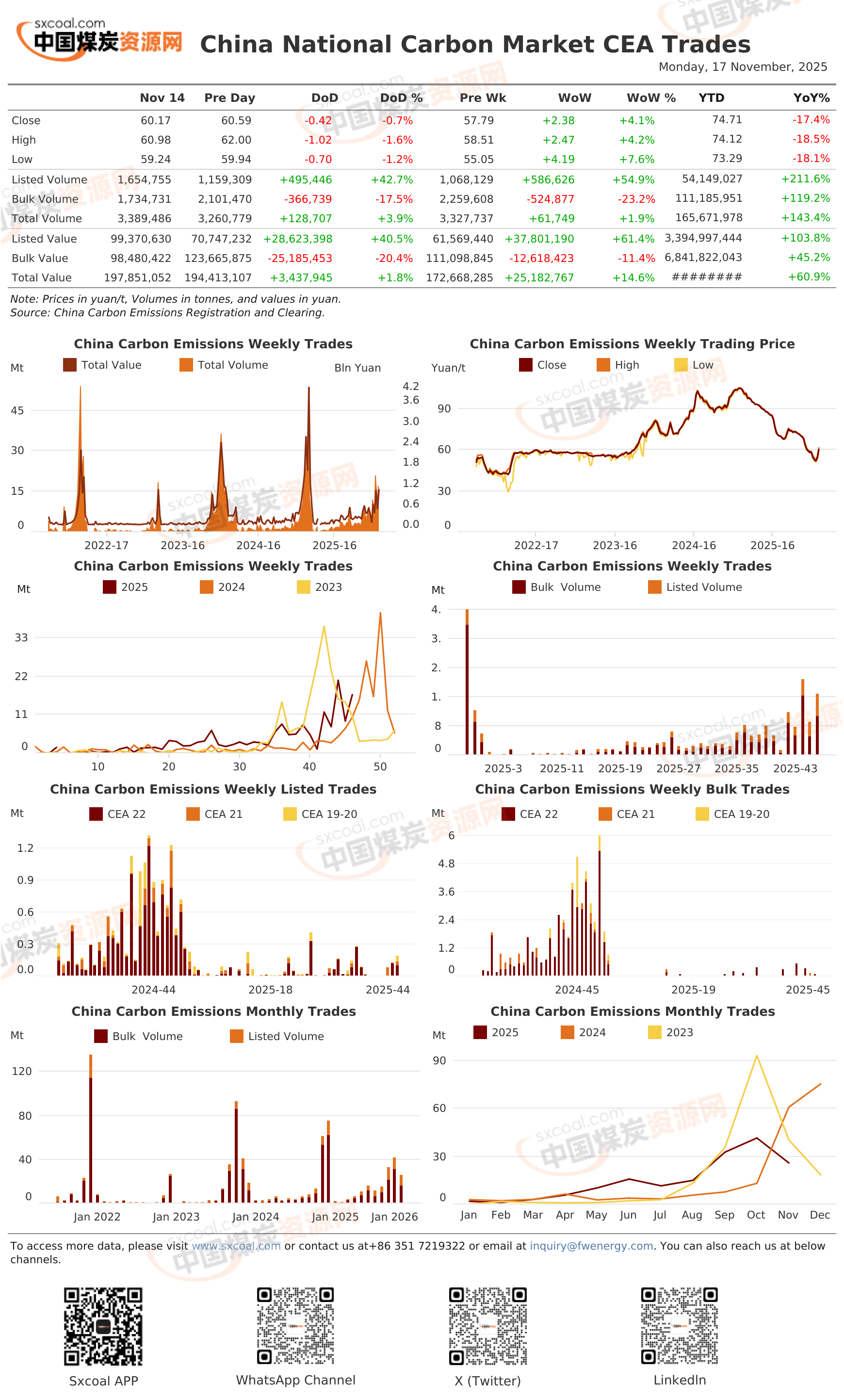 China's national carbon emission market CEA trading, including key indicators of daily prices, trading volume, transaction value, and daily and weekly changes.