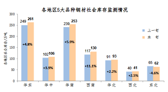 10月上旬,分地区来看,七大区域钢材社会库存除东北地区环比小幅下降外,其他区域均有所上升,其中西南地区上升幅度最大,具体情况见下图。