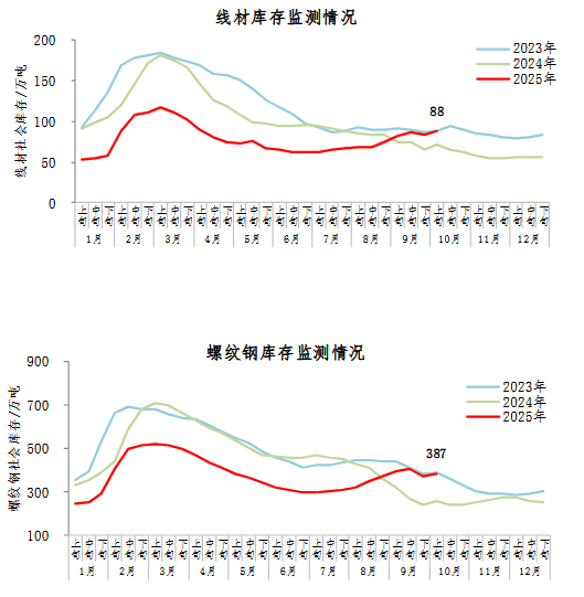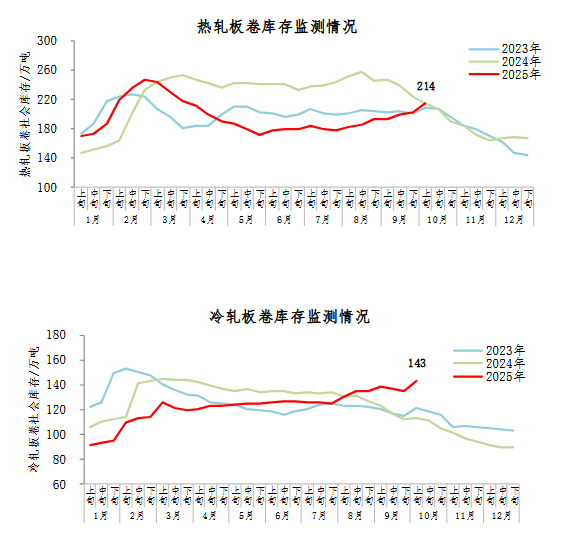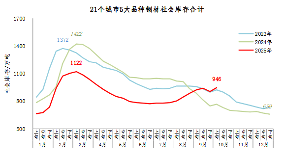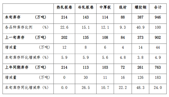 10月上旬,21个城市5大品种钢材社会库存946万吨,环比增加44万吨,上升4.9%,库存由降转升;比年初增加287万吨,上升43.6%;比上年同期增加183万吨,上升24.0%。