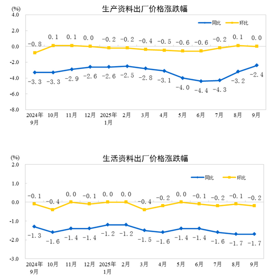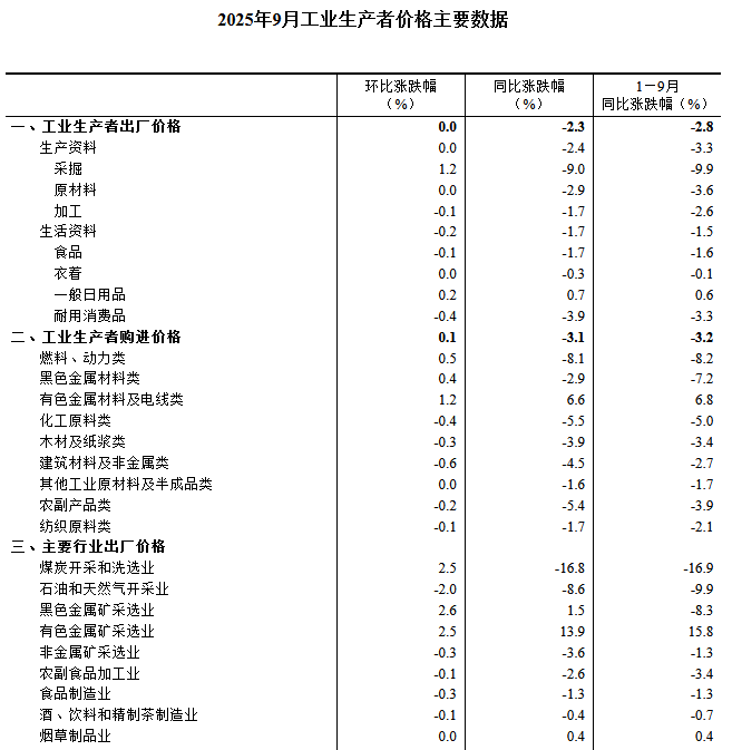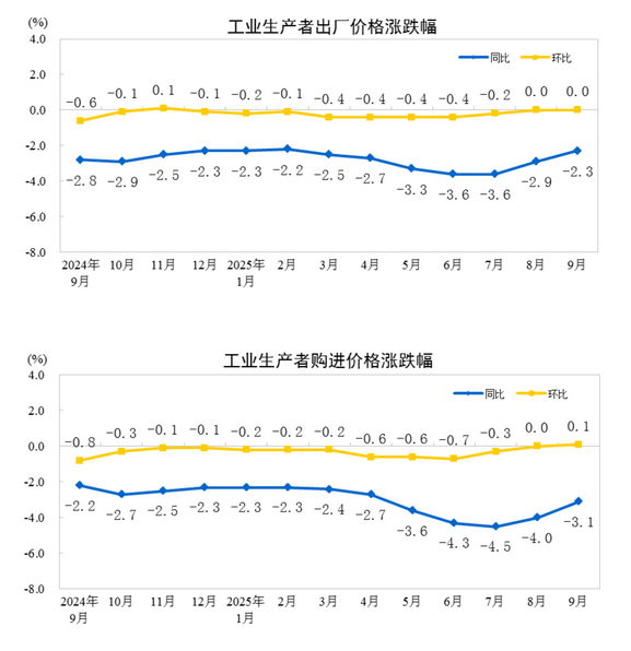 2025年9月份,全国工业生产者出厂价格同比下降2.3%,降幅比上月收窄0.6个百分点,环比继续持平。工业生产者购进价格同比下降3.1%,降幅比上月收窄0.9个百分点,环比上涨0.1%。1—9月平均,工业生产者出厂价格比上年同期下降2.8%,工业生产者购进价格下降3.2%。