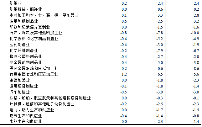 工业生产者购进价格中,燃料动力类价格下降8.1%,化工原料类价格下降5.5%,农副产品类价格下降5.4%,建筑材料及非金属类价格下降4.5%,黑色金属材料类价格下降2.9%,纺织原料类价格下降1.7%;有色金属材料及电线类价格上涨6.6%。