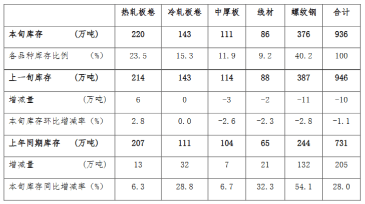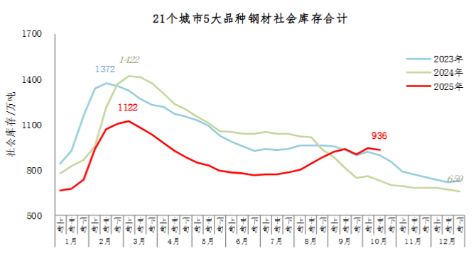 10月中旬,21个城市5大品种钢材社会库存936万吨,环比减少10万吨,下降1.1%,库存小幅波动;比年初增加277万吨,上升42.0%;比上年同期增加205万吨,上升28.0%。