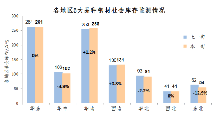 10月中旬,分地区来看,七大区域钢材社会库存环比各有升降,其中东北为减量、降幅最大地区,其他地区变化不大,具体情况见下图。