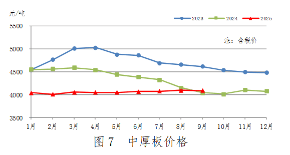 9月份,中厚板产量559万吨,同比增加1万吨,增幅0.1%;销售582万吨,均价4096元/吨,比上月下跌3元/吨;中厚板累计产量5016万吨,同比增加204万吨,增幅4.2%。中厚板产量、价格见图6、图7。
