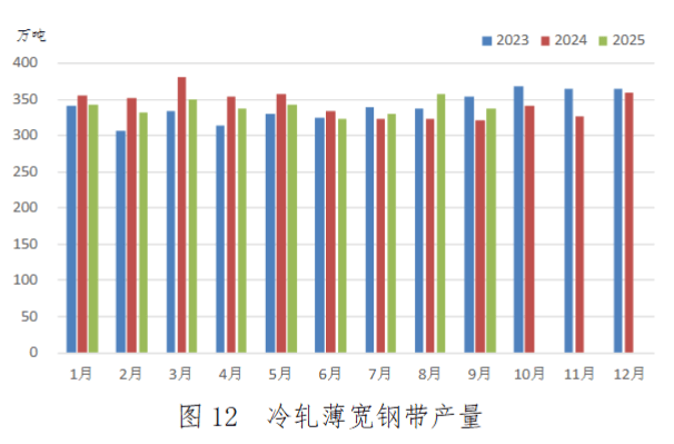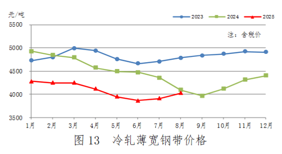 9月份,冷轧薄宽钢带产量337万吨,同比增加16万吨,增幅5.0%;销售325万吨,均价4101元/吨,比上月上涨74元/吨;冷轧薄宽钢带累计产量3050万吨,同比减少16万吨,降幅0.5%。冷轧薄宽钢带产量、价格见图12、图13。