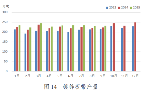 9月份,镀锌板产量232万吨,同比增加8万吨,增幅3.4%;销售228万吨,均价4910元/吨,比上月上涨83元/吨;镀锌板累计产量2090万吨,同比增加99万吨,增幅5.0%。镀锌板带产量、价格见图14、图15。