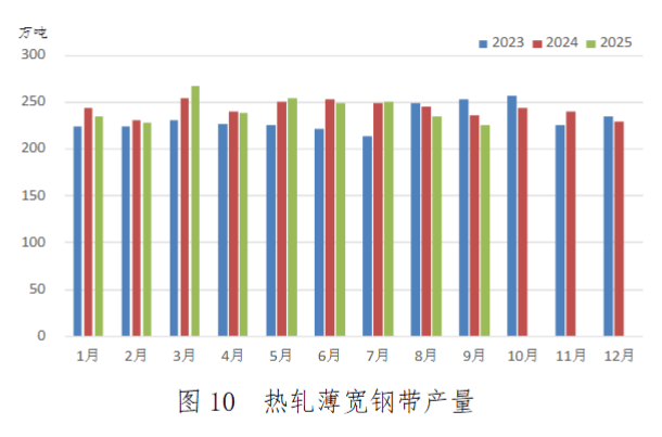 9月份,中厚宽钢带产量660万吨,同比增加11万吨,增幅1.7%;销售673万吨,均价3561元/吨,比上月上涨28元/吨;中厚宽钢带累计产量6046万吨,同比增加35万吨,增幅0.6%。中厚宽钢带产量、价格见图8、图9。