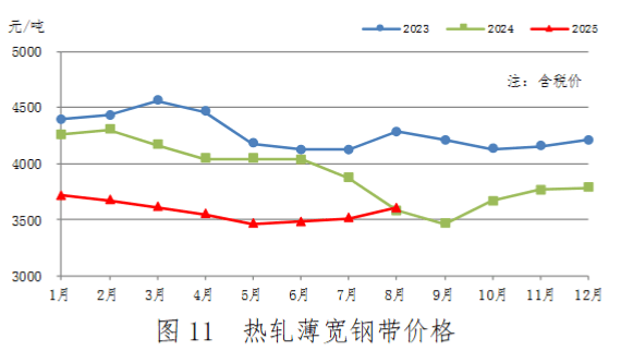 9月份,热轧薄宽钢带产量226万吨,同比减少10万吨,降幅4.3%;销售239万吨,均价3626元/吨,比上月上涨22元/吨;热轧薄宽钢带累计产量2174万吨,同比减少6万吨,降幅0.3%。热轧薄宽钢带产量、价格见图10、图11。