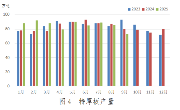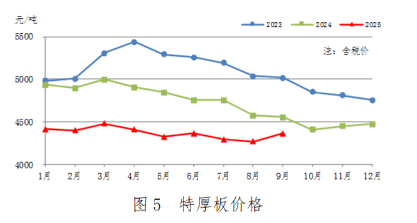 9月份,特厚板产量73万吨,同比减少8万吨,降幅9.6%;销售74万吨,均价4364元/吨,比上月上涨97元/吨;特厚板累计产量775万吨,同比增加21万吨,增幅2.8%。特厚板产量、价格见图4、图5。