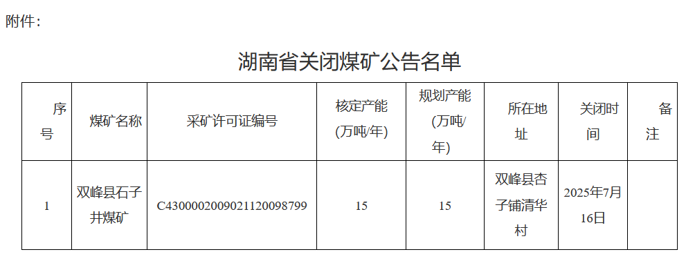 湖南省发布关闭煤矿公告