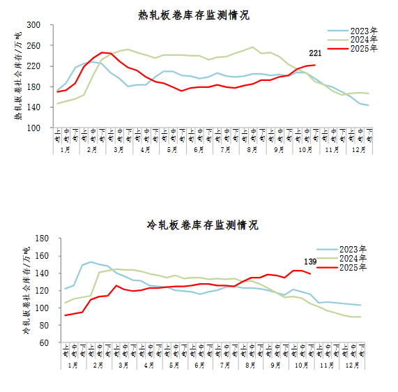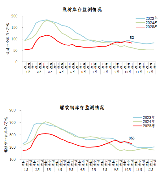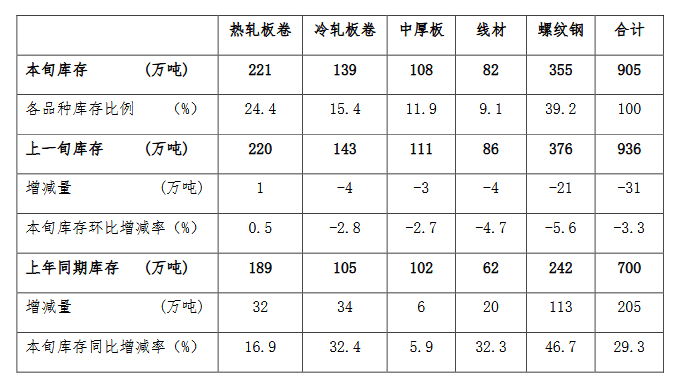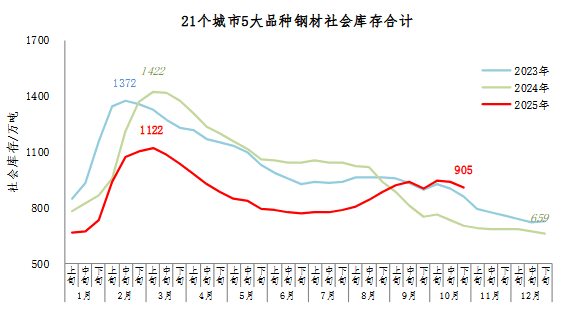10月下旬,21个城市5大品种钢材社会库存905万吨,环比减少31万吨,下降3.3%,库存继续小幅下降;比年初增加246万吨,上升37.3%;比上年同期增加205万吨,上升29.3%。