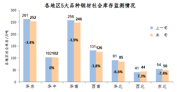 10月下旬,分地区来看,七大区域钢材社会库存环比除华中、西北外,其他地区均有不同程度下降,其中华南为减量最大地区,东北为降幅最大地区;华中库存环比持平,西北库存环比上升幅度较大,具体情况见下图。