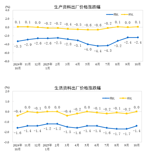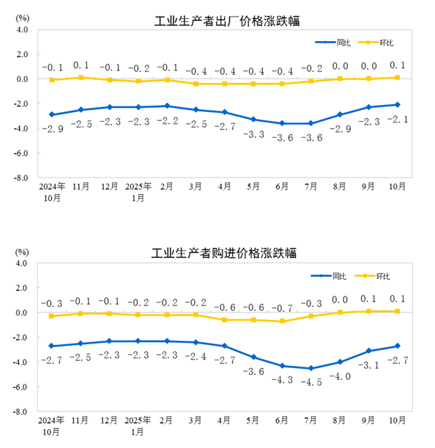 2025年10月份,全国工业生产者出厂价格同比下降2.1%,降幅比上月收窄0.2个百分点;环比由上月持平转为上涨0.1%。工业生产者购进价格同比下降2.7%,降幅比上月收窄0.4个百分点;环比上涨0.1%,涨幅与上月相同。1—10月平均,工业生产者出厂价格比上年同期下降2.7%,工业生产者购进价格下降3.2%。