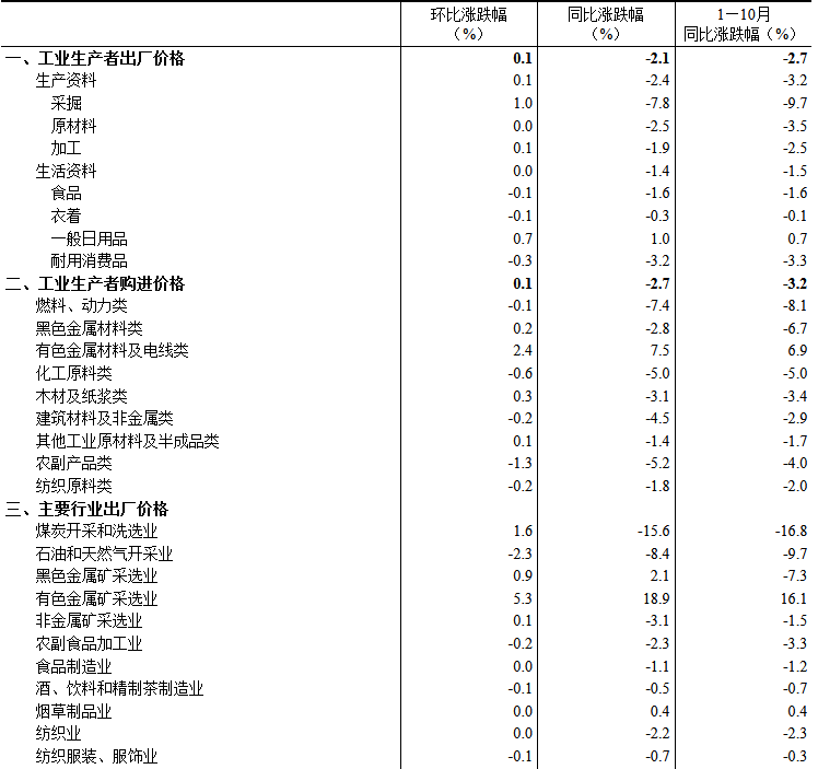 10月份,工业生产者出厂价格中,生产资料价格上涨0.1%,影响工业生产者出厂价格总水平上涨约0.08个百分点。其中,采掘工业价格上涨1.0%,原材料工业价格持平,加工工业价格上涨0.1%。生活资料价格持平。其中,食品、衣着价格均下降0.1%,一般日用品价格上涨0.7%,耐用消费品价格下降0.3%。