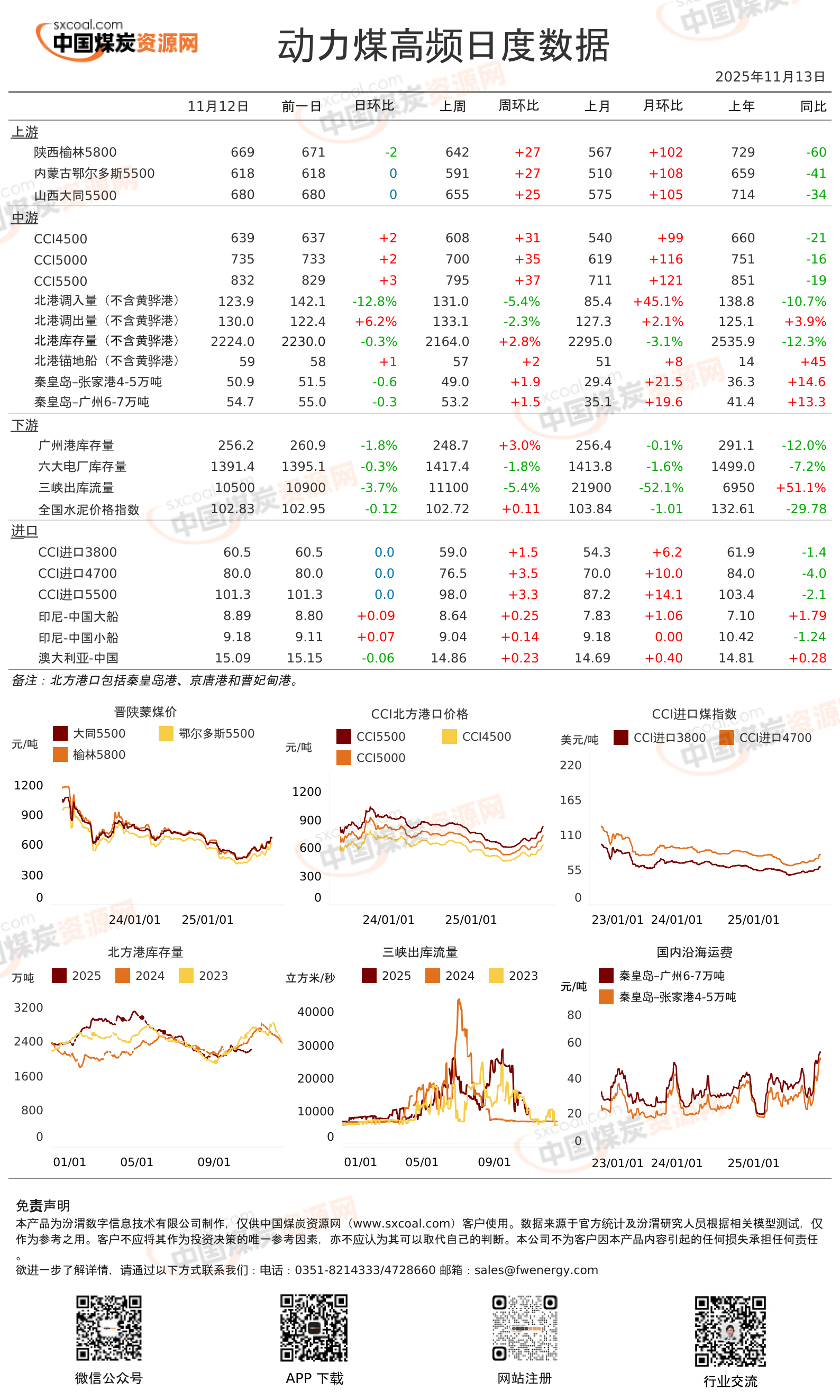 动力煤日度数据跟踪(2025.11.13)价格动力煤全国煤炭中国煤炭资源网2025.11.13 09:12:00字数 33阅读数104动力煤市场重要数据跟踪,涵盖主产地、中转港、下游及进口市场价格、库存、运费等。中国煤炭资源网出品,未经许可,不得转载。