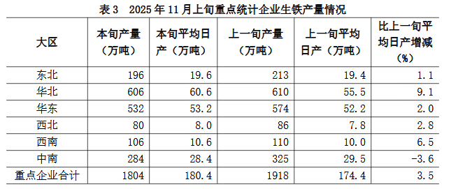 11月上旬六大地区中,除中南地区重点统计企业生铁日产量较上一旬有所下降外,其它地区均有不同程度增长(详见表3),具体为: