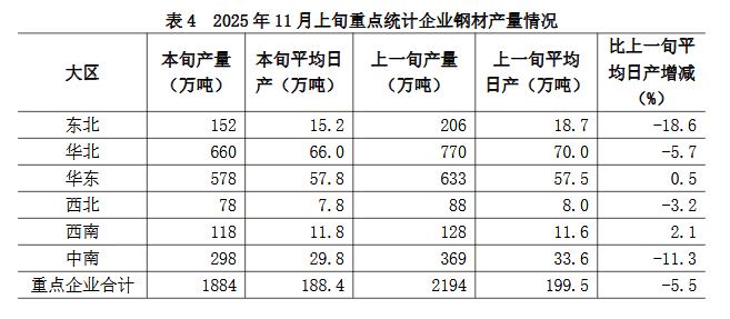 11月上旬六大地区中,除华东、西南地区重点统计企业钢材日产量较上一旬有所增长外,其它地区均有不同程度下降(详见表4),具体为: