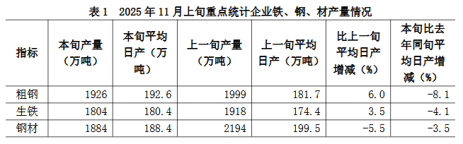2025年11月上旬,重点统计钢铁企业共生产粗钢1926万吨,平均日产192.6万吨,日产环比增长6.0%;生铁1804万吨,平均日产180.4万吨,日产环比增长3.5%;钢材1884万吨,平均日产188.4万吨,日产环比下降5.5%(见表1)1。
