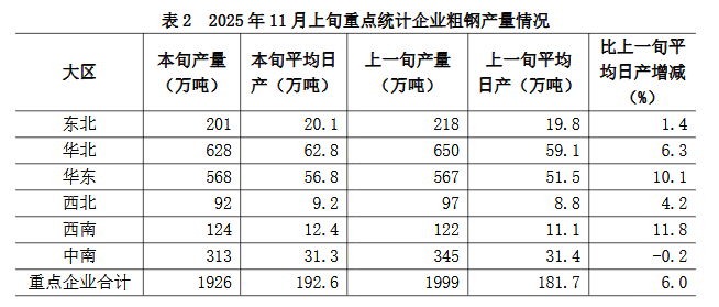 11月上旬六大地区中,除中南地区重点统计企业粗钢日产量较上一旬略有下降外,其它地区均有不同程度增长(详见表2),具体为: