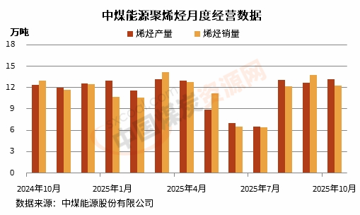 2025年10月份,中煤能源聚乙烯产量6.7万吨,同比增长8.1%,环比增长3.1%;销量6.0万吨,同比下降9.1%,环比下降13%。聚丙烯产量6.5万吨,同环比均增长4.8%;销量6.3万吨,同比下降1.6%,环比下降8.7%。