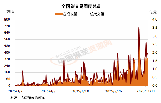 本年度1月1日至11月14日,全国碳市场碳排放配额成交量165,671,978吨,成交额10,256,444,337.50元。截至2025年11月14日,全国碳市场碳排放配额累计成交量795,940,642吨,累计成交额53,289,171,441.01元。