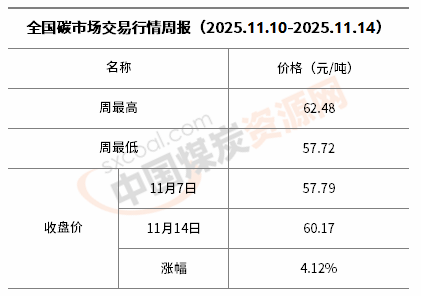 本周全国碳市场综合价格行情为:最高价62.48元/吨,最低价57.72元/吨,收盘价较上周最后一个交易日上涨4.12%。
