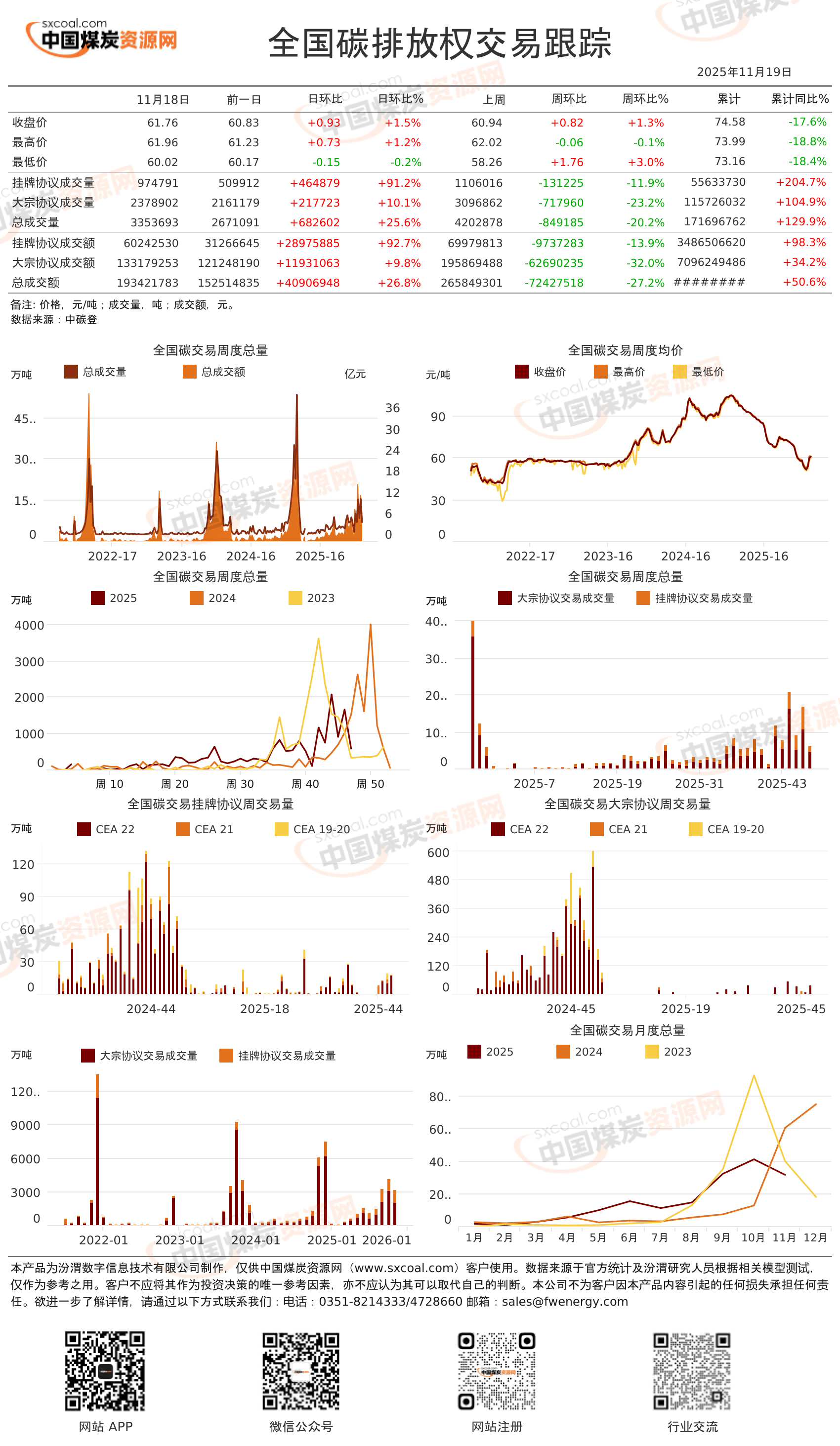 全国碳排放权交易跟踪(2025.11.19)价格碳碳市场碳价配额排放交易中国煤炭资源网2025.11.19 10:02:00字数 40阅读数5全国碳市场排放权交易情况汇总,当日价格、成交量和成交额,日周环比变化等关键指标。中国煤炭资源网出品,未经许可,不得转载。