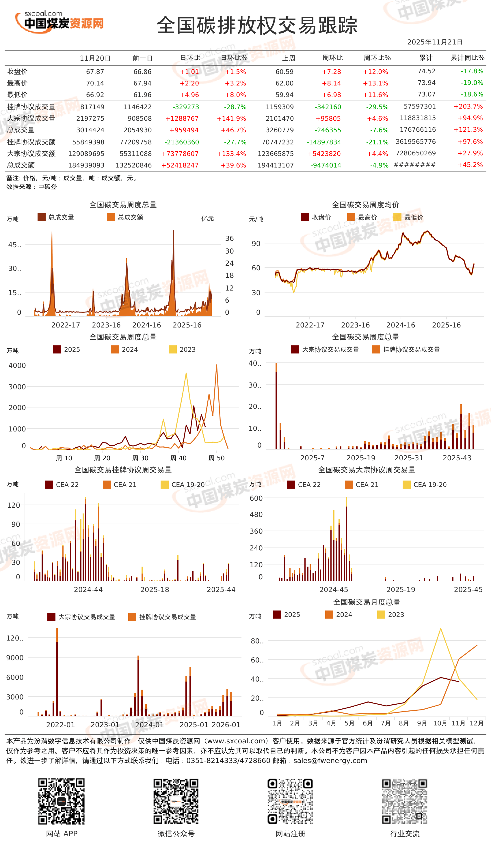 全国碳排放权交易跟踪(2025.11.21)价格碳碳市场碳价配额排放交易中国煤炭资源网2025.11.21 10:02:00字数 40阅读数1全国碳市场排放权交易情况汇总,当日价格、成交量和成交额,日周环比变化等关键指标。中国煤炭资源网出品,未经许可,不得转载。
