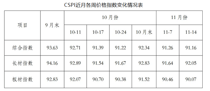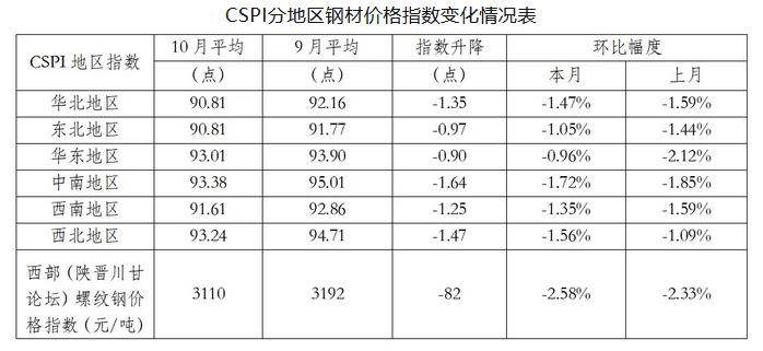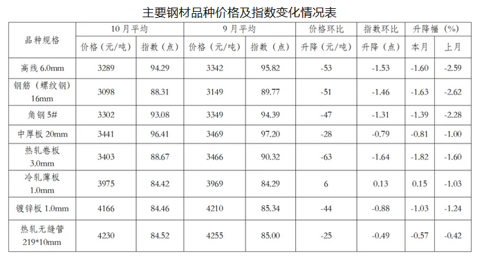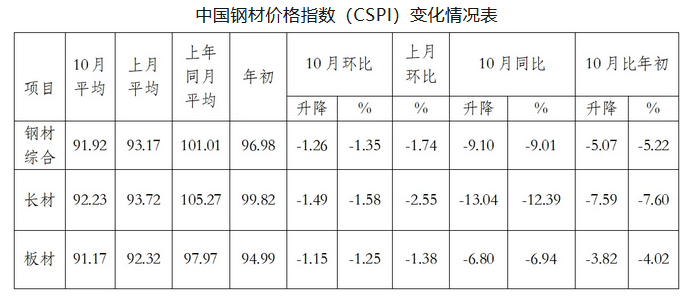 1-10月份,CSPI长材指数平均值为95.12点,同比下降11.10点,降幅为10.45%;板材指数平均值为92.03点,同比下降9.47点,降幅为9.33%。