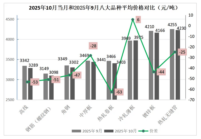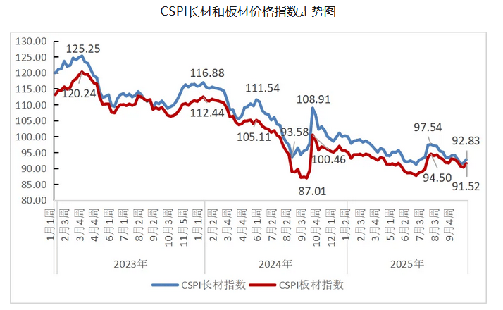 截至2025年10月末,CSPI长材指数为92.83点,环比下降1.33点,降幅为1.41%;CSPI板材指数为91.52点,环比下降1.31点,降幅为1.41%;与上年同期相比,CSPI长材、板材指数分别下降10.27点和下降5.26点,分别下降9.96%和5.44%。
