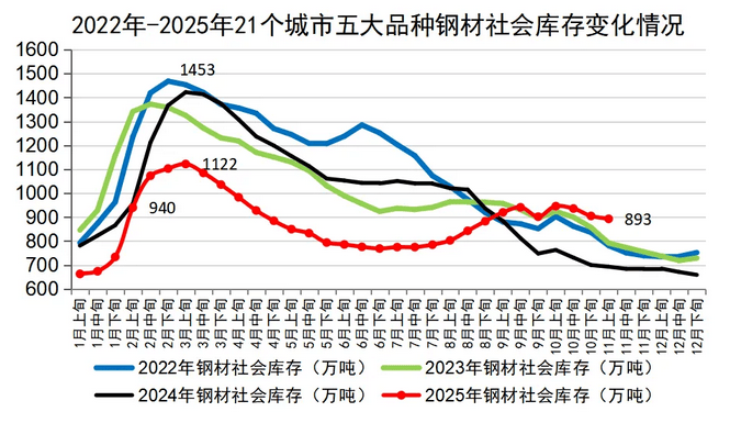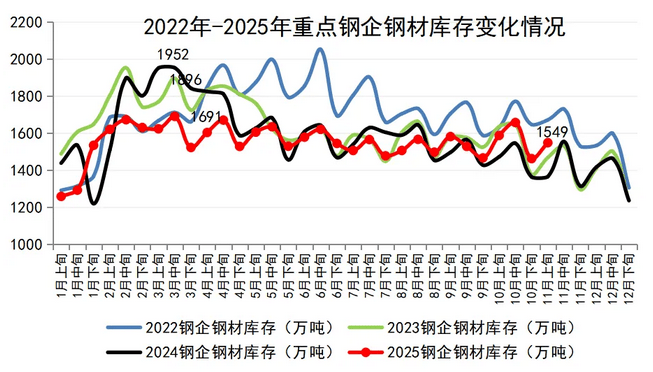 从企业库存来看,11月上旬重点钢企钢材库存位于近三年历史同期高位。2025年11月上旬重点钢铁企业钢材库存量为1549万吨,旬环比增加86万吨,上升5.9%;比上月同旬减少39万吨,下降2.5%;比去年同旬增加183万吨,上升13.4%。