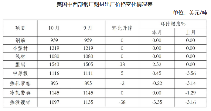 2025年10月份,CRU北美钢材价格指数为229.4点,环比下降3.3点,降幅为1.4 %;美国制造业PMI为48.7%,环比下降0.4个百分点。本月美国中西部钢厂钢材品种价格走势以稳为主,型钢明显上升,升幅2.52%,中厚板稳中有升,热轧带卷平稳运行,热浸镀锌价格明显下降,降幅3.35%,其余钢材品种价格均与上月持平。(见下表)