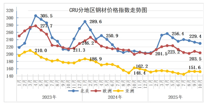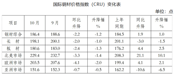 2025年1-10月,CRU国际钢材价格指数平均值为189.4 点,同比下降11.2点,降幅为5.6 %。其中,CRU长材指数平均值为196.6点,同比下降10.6点,降幅为5.1%;CRU板材指数平均值为185.8点,同比下降11.5点,降幅为5.8 %。