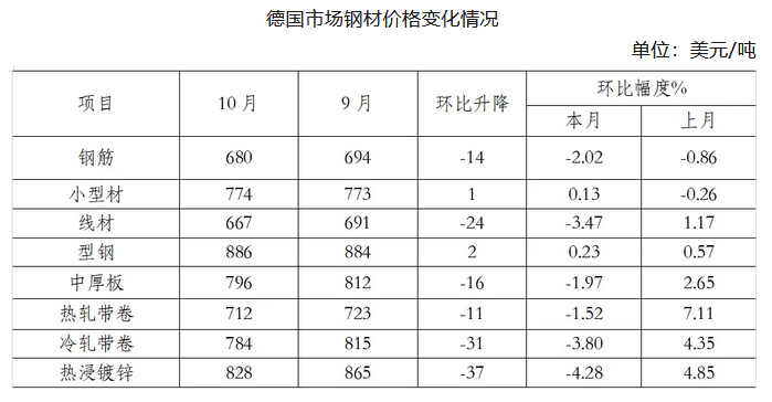 10月份,CRU欧洲钢材价格指数为203.5点,环比下降4.1点,降幅为2.0 %;2025年10月,欧元区制造业PMI终值为50,相较于9月份略有回升,自收缩区间重新回到了荣枯分界线上,主要成员国制造业PMI均有所回升:德国、法国、意大利、西班牙制造业PMI指数分别为49.6%、48.8%、49.9%、52.1%,分别升0.1、0.6、0.9和0.6个百分点。本月德国市场主要钢材品种价格除小型材和型钢平稳运行外其余均下降,钢筋和热轧带卷稳中有降,热浸镀锌降幅较大,为4.28%。(见下表)
