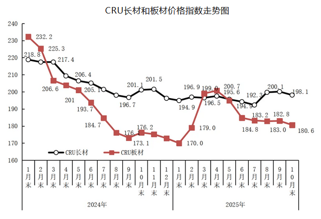 2025年10月份,CRU长材指数为198.1点,环比下降2.0点,降幅为1.0 %;CRU板材指数为180.6 点,环比下降2.4点,降幅为1.3 %;与去年同期相比,CRU长材指数下降3.0点,降幅为1.5 %;CRU板材指数上升4.4 点,升幅为2.5 %。(见下图)