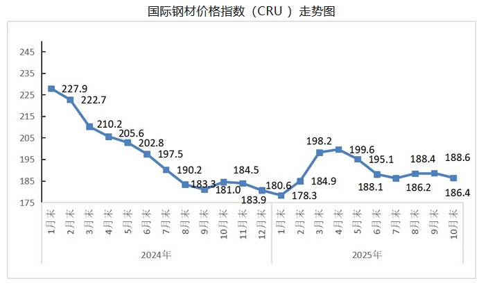 2025年10月份,CRU国际钢材价格指数为186.4点,环比下降2.2点,降幅为1.2%;同比上升1.9点,同比升幅为1.0 %。(见下图)