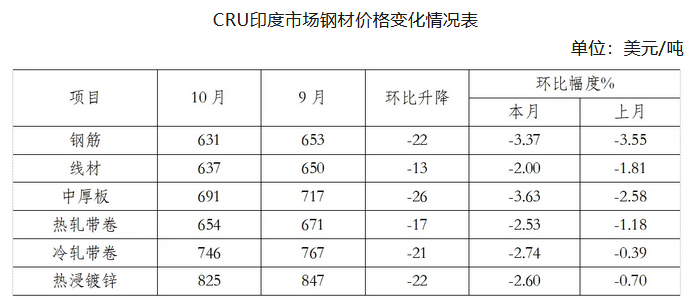 2025年10月份,CRU亚洲钢材价格指数为151.6点,比上月下降0.7点,降幅为0.5 %;日本制造业PMI为48.2%,环比下降0.3个百分点;韩国制造业PMI为49.4%,环比下降1.3个百分点;印度制造业PMI为59.2%,环比上升1.5个百分点。2025年10月份中国制造业生产活动较上月放缓,PMI降至49.0%。本月印度市场钢材价格中,主要钢材品种价格均下降,其中,中厚板降幅较大,为3.63%,线材稳中有降。(见下表)