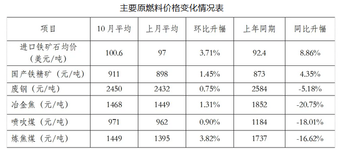 从原燃料来看,与9月相比,主要原燃料各品种平均价格均上升。其中,炼焦煤涨幅较大,为3.82%,废钢涨幅较小,为0.75%,原燃料对钢价的支撑作用有所增强。(见下表)