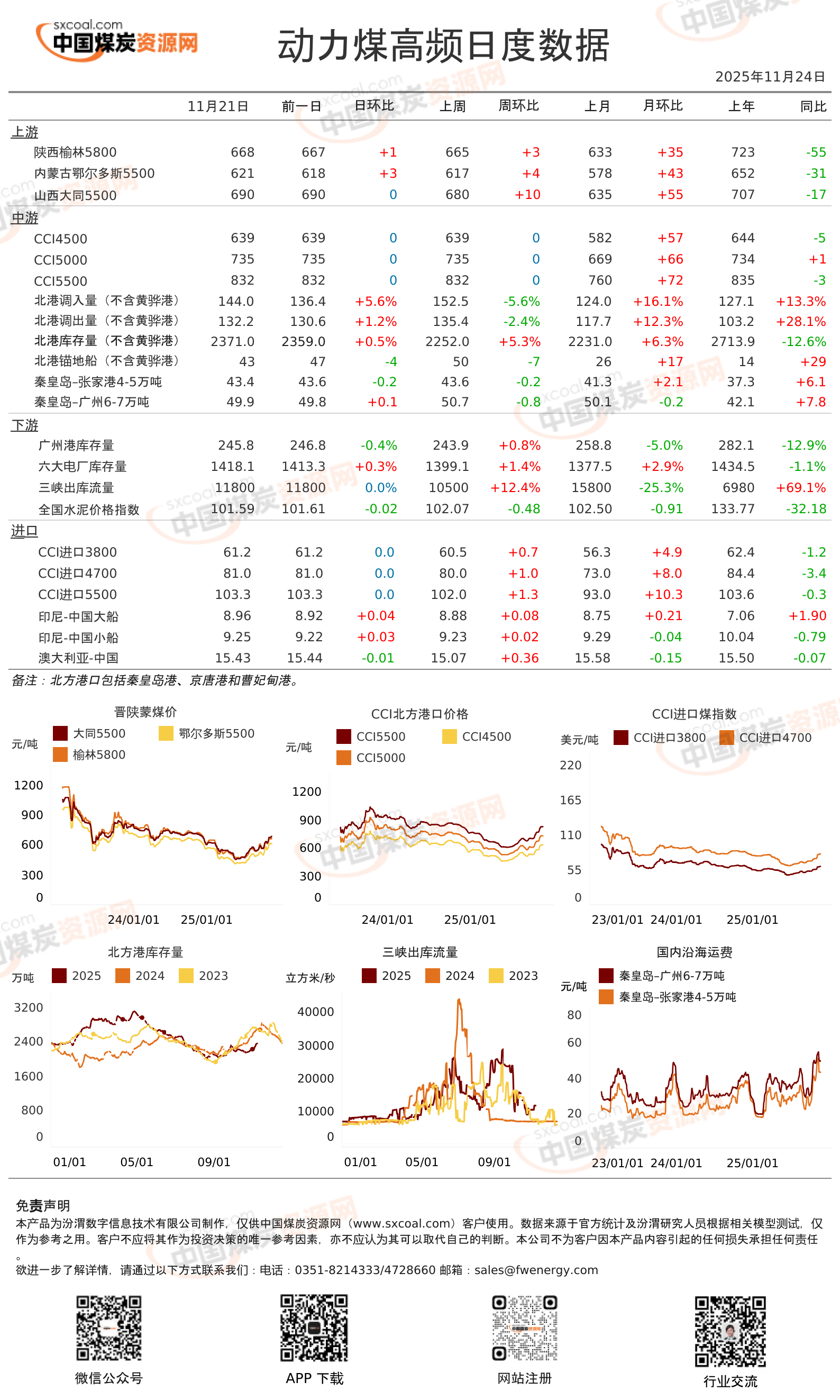 动力煤日度数据跟踪(2025.11.24)价格动力煤全国煤炭中国煤炭资源网2025.11.24 09:12:00字数 33阅读数115动力煤市场重要数据跟踪,涵盖主产地、中转港、下游及进口市场价格、库存、运费等。中国煤炭资源网出品,未经许可,不得转载。