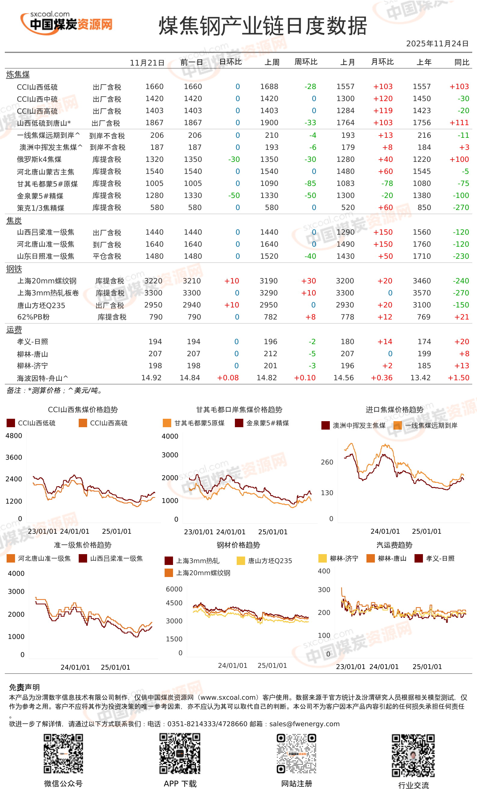 煤焦钢日度数据跟踪(2025.11.24)价格炼焦煤煤炭焦炭钢铁中国煤炭资源网2025.11.24 09:20:00字数 30阅读数46煤焦钢市场重要数据跟踪,涵盖主产地、港口、下游及进口市场价格、运费等。中国煤炭资源网出品,未经许可,不得转载。